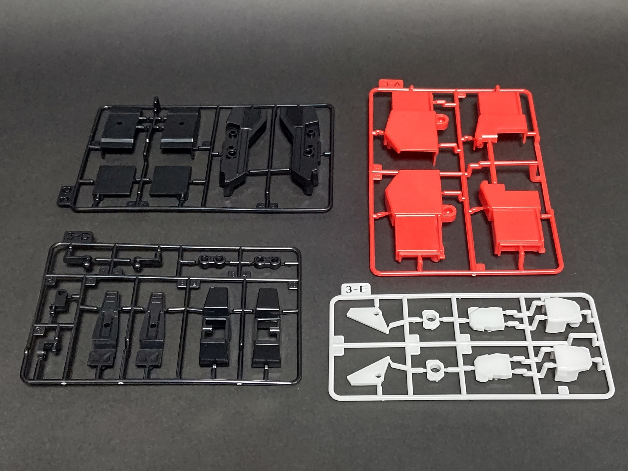 今回は3箱ごとにバラの状態から合体してマイトガインになる所まで組んでいますが、写真の量が多くなってしまったのでページを前半と後半の2つに分けています。ざっくり箱開封・ランナー・個別の完成写真が前半、合体後の写真が後半になっています。