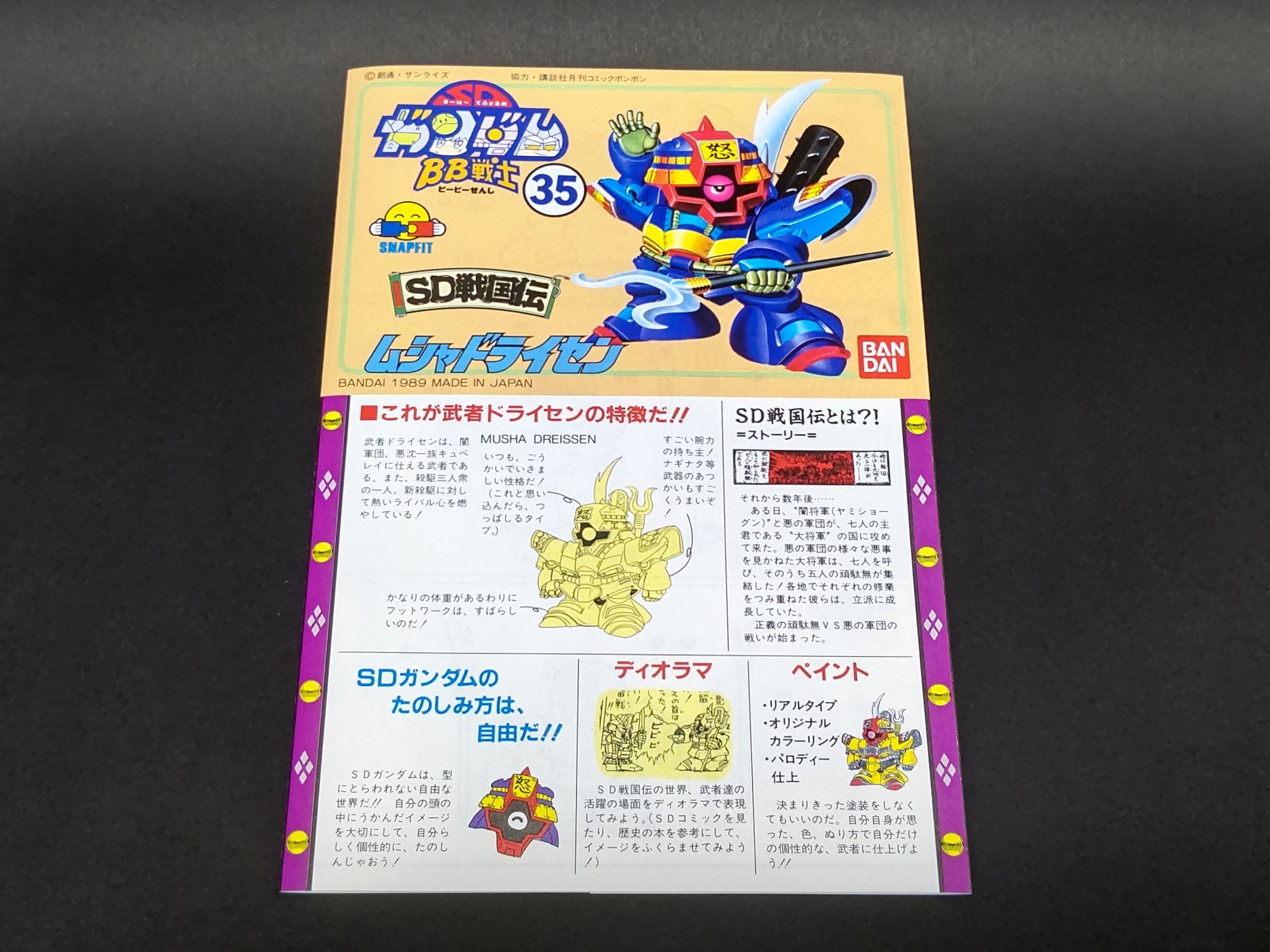 BB戦士No.3 ドラクンに追加パーツを加えて武者としたキット。ランナーが丸々流用されているので組み替えでドラクンを組むことも可能。ドラクンというのはBB戦士の最初期(No.1~6まで)にあったガンダムシリーズのMSをオリジナルキャラクターとしてSD化したものでモチーフはドライセン(ザクやドムを差し置いてNo.3がドライセンと言う・・・)。BB最初期のキットと言うこともあってポリキャップが使われていなかったり、BB弾風の丸い弾丸を発射するギミックが特徴。